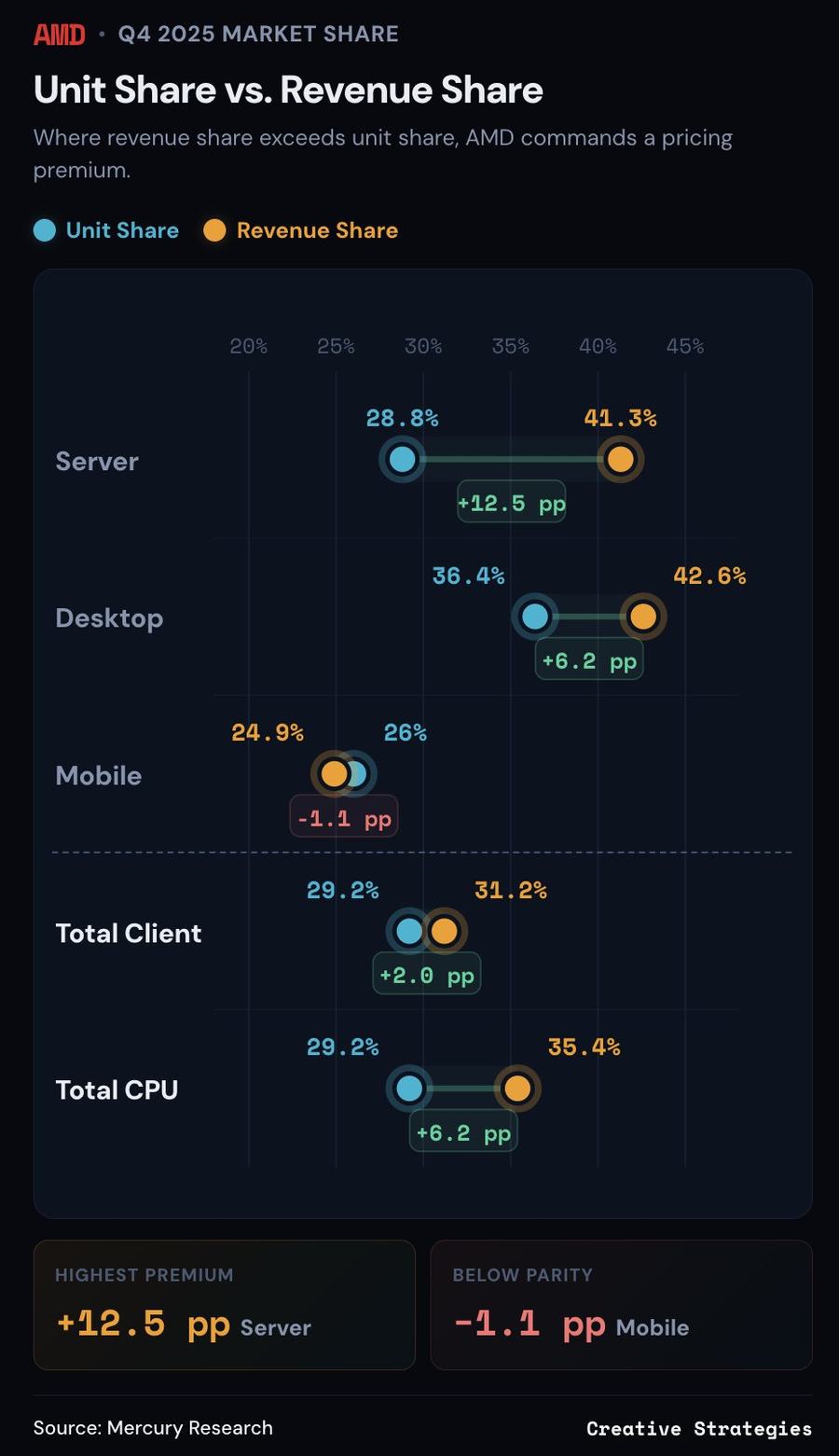 服务器领域,EPYC系列处理器推动营收份额达到41.3%,同比增长4.9个百分点,环比增长1.8个百分点;出货量份额逼近30%,达到28.8%,Genoa、Turin及前代产品的持续渗透,叠加即将推出的Zen 6架构Venice服务器CPU,进一步巩固了其在企业级和AI计算市场的优势。桌面市场表现最为亮眼,营收份额升至42.6%,同比大幅增长14.6个百分点,出货量份额占据36.4%,这主要得益于Ryzen X3D系列在游戏市场的领先地位,以及前代AM4平台处理器因内存价格上涨带来的性价比优势,在品牌机和DIY市场实现全面热销。移动市场方面,出货量份额提升至26.0%,营收份额为24.9%,两项数据同比均增长3.3个百分点,随着Ryzen AI 400和Ryzen AI MAX系列的持续推进,AMD在AI PC领域与英特尔最新产品形成直接竞争,未来增长潜力可期。