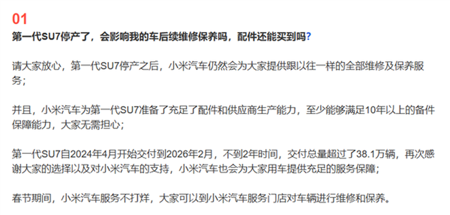 车型停产最受关注的莫过于老车主的售后保障问题,不少初代SU7车主担忧,车辆停产后故障维修、日常保养将难以维系。针对这一核心顾虑,小米汽车官方于2月12日发布的《小米汽车答网友问(第210集)》中给出明确回应,彻底为老车主吃下“定心丸”。