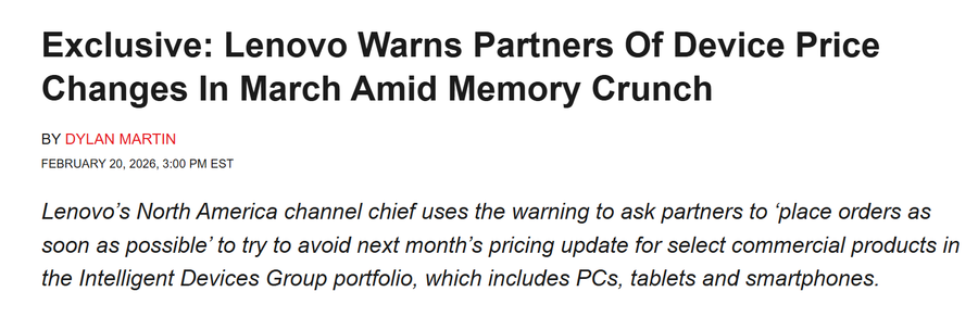 伴随着内存和存储产品的供应紧张以及价格飙升,部分存货充足的大厂也逐渐陷入考验。联想现已向全球渠道合作伙伴发出通知,表示因为全球内存芯片持续短缺,预计将于2026年3月上调部分商用PC及服务器产品价格。联想北美渠道负责人韦德·麦克法兰德在2月2日的信函中透露,此次调价涉及智能设备事业部(IDG)和基础设施解决方案事业部(ISG)的特定产品及配置,具体细节将后续同步。