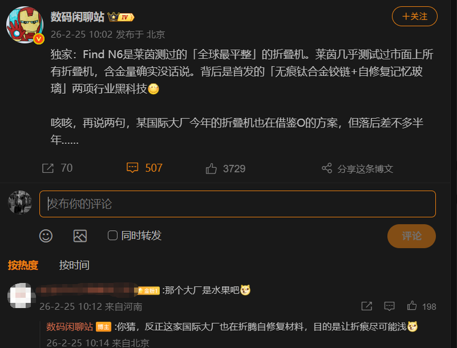 从网友晒出的真机实拍图来看,OPPO Find N6展开后屏幕“一马平川”,无论是正视、侧视,都几乎看不到丝毫折痕,触感上也没有突兀的凹陷,彻底告别了折叠屏“中间有条缝”的尴尬。有数码博主直言,某国际大厂(暗指苹果)也在借鉴这套无痕方案,但技术差距至少落后半年,足以见得OPPO在折叠屏领域的技术沉淀有多深厚。