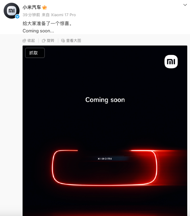 就在今天,小米官方放出疑似新车尾灯的预告海报,并留言 “给大家准备了一个惊喜”,双重线索让外界对其充满期待。