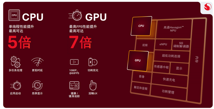 性能方面,骁龙可穿戴平台至尊版采用全新五核CPU架构,升级后的CPU与GPU性能较前代实现跨越式提升,其中CPU性能最高提升5倍,GPU性能最高提升7倍,可满足当下消费者对高响应速度的需求,同时为未来更复杂的AI工作负载预留空间。