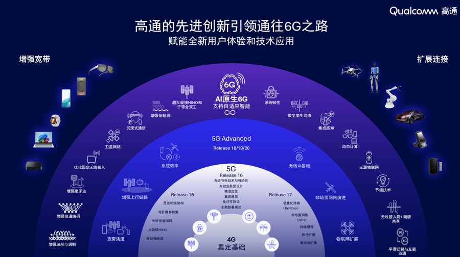 6G将贯穿从终端设备,到无线接入网(RAN),再到电信边缘服务器,直至数据中心的整个链路,6G的成功需要许多关键要素的协同。高通正推进超大规模MIMO、子带全双工等底层技术革新,同时与诺基亚、爱立信、中兴通讯、三星等合作伙伴开展6G射频校准与互操作性测试,预计2028年推出6G预商用终端,2029年实现商用。
