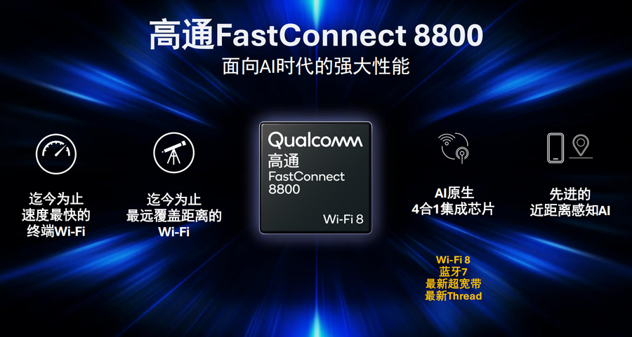面对AI时代激增的数据流量与边缘推理需求,高通推出高通FastConnect 8800移动连接系统,作为全球唯一一款集成Wi-Fi 8、蓝牙7、最新UWB与Thread技术的单一芯片解决方案,其搭载近距离感知技术并通过系统级AI优化,实现速度与覆盖的双重突破。