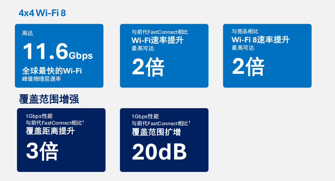 该芯片是全球首款支持Wi-Fi 4x4的移动芯片,部分地区峰值物理层速率可达11.6Gbps,是上一代产品速率的2倍,且在两倍于前代的距离范围内仍能保持千兆级连接,即便远离接入点也能拥有稳定信号。值得注意的是,其4×4 Wi-Fi模式可根据用户需求灵活切换,无需对设备系统进行大幅重新设计,兼顾性能与实用性。