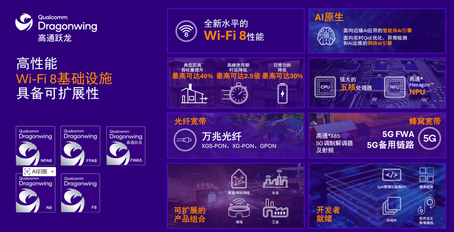 旗舰级的高通跃龙NPro A8 Elite、FiberPro A8 Elite及第五代固定无线接入平台至尊版,采用5x5射频架构,可扩大高速网络覆盖范围、增强Mesh Wi-Fi性能。通过先进协调机制与优化处理,在繁重网络负载下仍能保持稳定响应,吞吐量最高提升40%,峰值时延降低2.5倍,日常功耗降低30%。