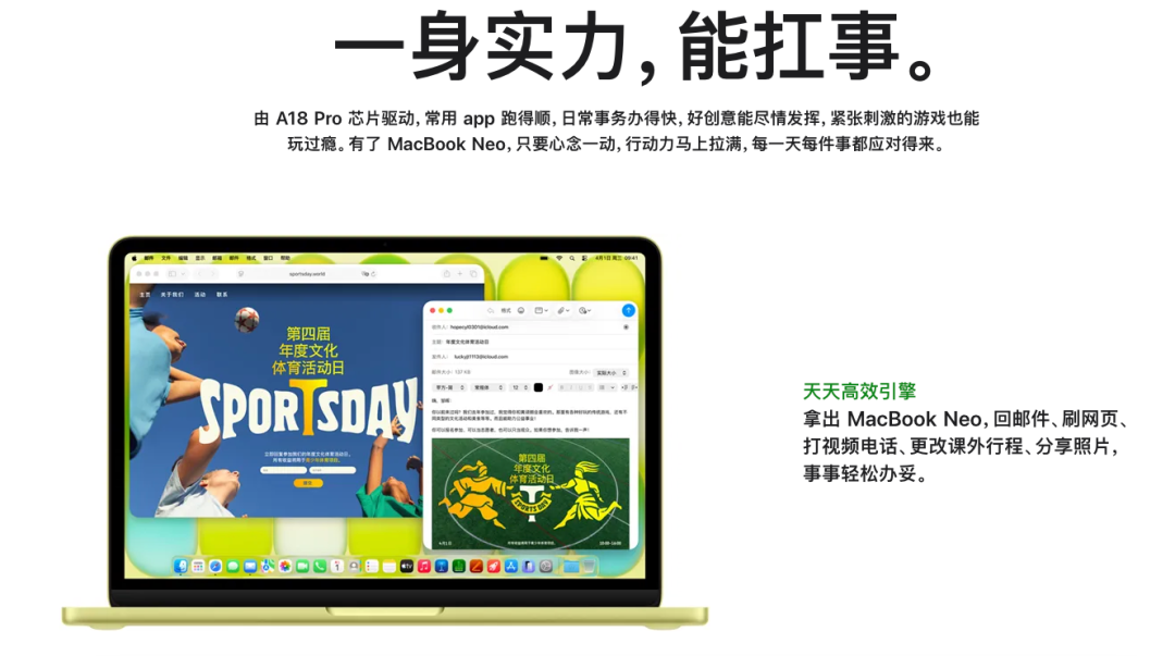 另一方面,MacBook Neo的核心竞争力的并非配置堆砌,而是“够用的性能+极致的能效+流畅的生态”,这恰好击中了轻办公用户的核心需求。对于多数学生和职场新人而言,笔记本主要用于文档编辑、网页浏览、视频会议等轻量任务,并不需要高端旗舰配置,而MacBook Neo的A18 Pro芯片在满足这些需求的同时,还能提供更持久的续航和更流畅的使用体验,反观同价位Windows办公本,往往存在开机卡顿、多任务运行不畅、续航不足等问题,难以与之抗衡。