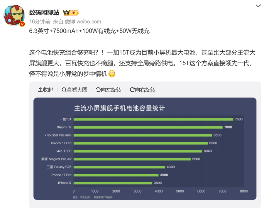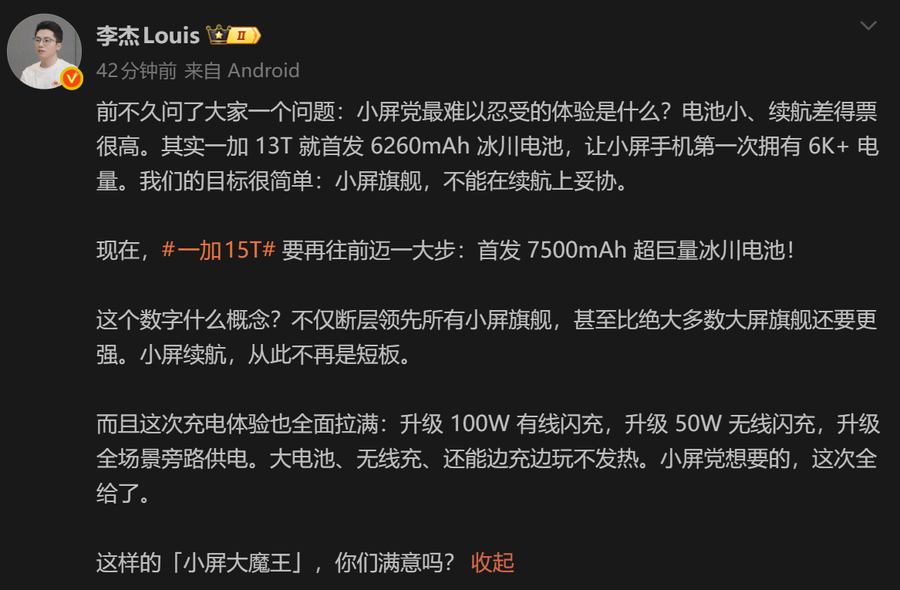 一加15T将在3月发布,号称“小屏大魔王”和“小屏党期待的Dream Phone”,新机将在性能、续航和体验等方面全面提升。中国区总裁李杰今日宣布,一加15T将首发7500mAh超大冰川电池,打破小屏手机续航短板,让其在电池表现上远超同类产品,甚至领先绝大多数大屏旗舰。