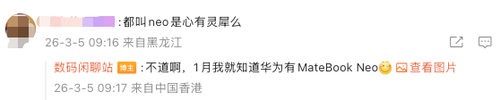 由于两款新品均命名为“Neo”,不少网友纷纷质疑:“苹果和华为都叫Neo,是心有灵犀么?”对此,爆料博主@数码闲聊站 回应称,早在今年1月份就已经得知华为有MateBook Neo这款产品,并非跟风命名,两者只是恰好撞名。