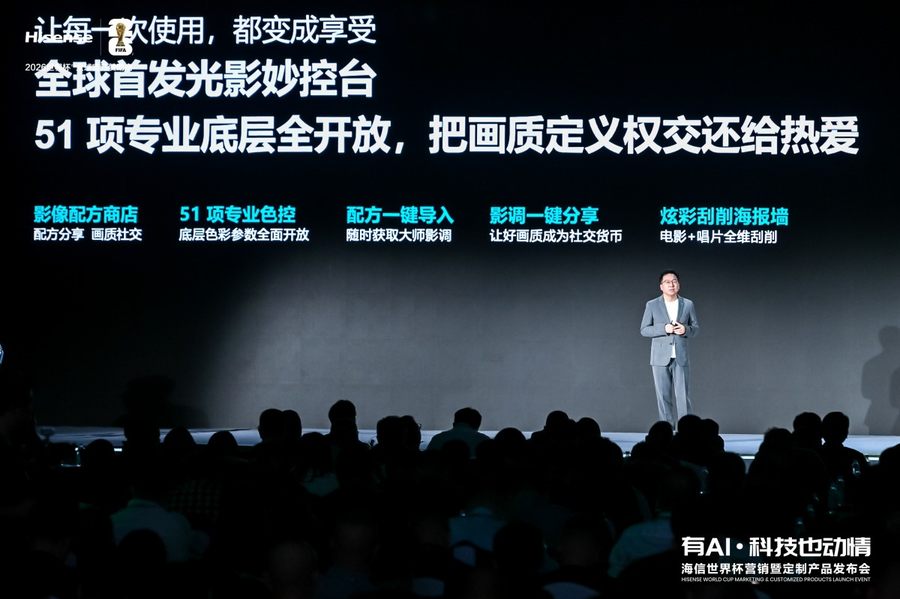 海信UX2026款搭载行业首创光影妙控台,内置大师级调色方案可一键复刻专业画质,更开放 51 项核心参数支持资深玩家精细调节,更有调色配方商店,未来将汇集导演与专业调色师的大师方案,支持一件复制,普通用户也能轻松调出专业级画面,解锁画质调试互动新体验。