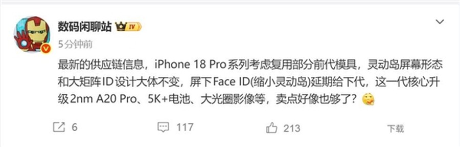 然而,最新供应链消息却让这一期待落空。苹果可能将屏下Face ID的应用推迟,最快要等到2027年的机型才能实现。这意味着iPhone 18 Pro的灵动岛形态或将维持现状,不会发生显著变化。爆料显示,新机在很大程度上将沿用前代产品的部分模具,其整体工业设计与灵动岛样式预计与iPhone 17 Pro高度一致,外观上的惊喜感相对有限。