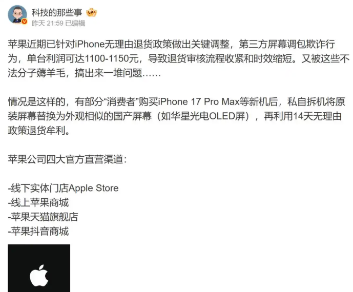 近期,针对苹果直营店的退货诈骗事件被曝光,不法分子钻苹果14天无理由退货政策的空子,用隐蔽的技术手段调包手机零件,轻松套利,引发了全网广泛关注。