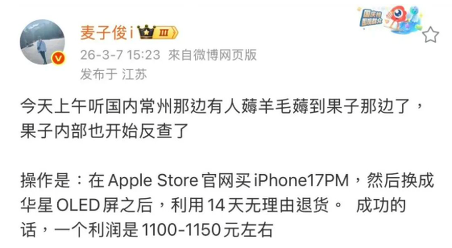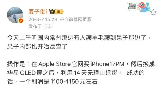 据业内人士详细测算,单靠这种“一换一退”的非法操作,每台手机仅屏幕的差价利润就高达1100元至1150元。更离谱的是,骗子全程不需要承担任何购机成本,退机后既能拿回全款,还能额外赚一块价值不菲的苹果原装高端屏幕,堪称“一本万利”的黑心操作,甚至有不法分子专门盯着iPhone 16、17系列等新款机型下手。