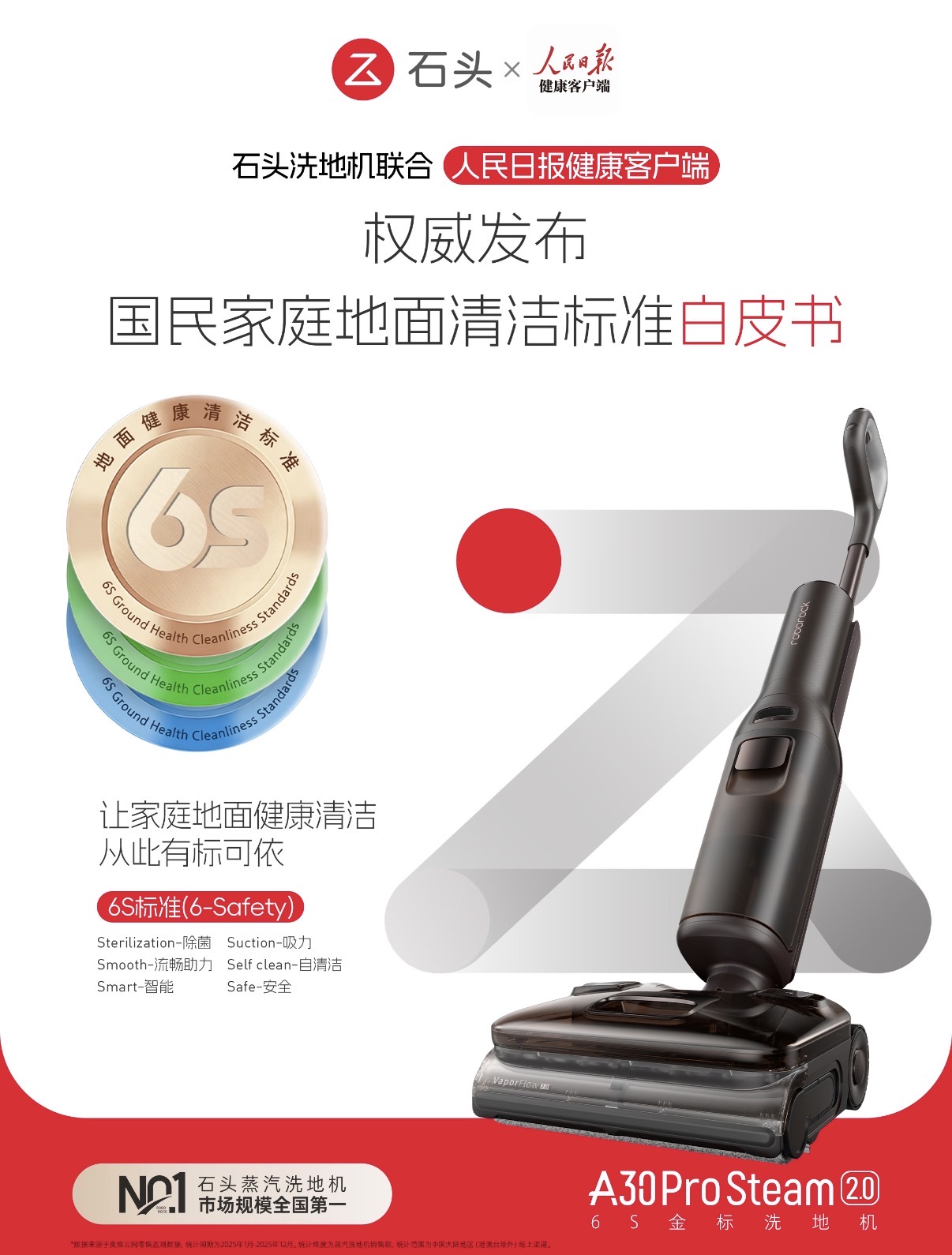 “双冠”佳绩背后,是石头科技对家庭健康清洁深层次的洞察。正是基于这种深厚的用户积累与市场话语权,石头科技在AWE 2026展会现场,与人民日报健康客户端共同发布《家庭地面清洁标准白皮书》,提出“6S地面健康清洁标准”,从除菌、吸力、智能化、自清洁、安全等多个维度,全面规范家庭地面清洁要求。而A30 Pro Steam 2.0正是能够实现这一标准的代表性产品,将销量领先优势延伸为行业标准示范,体现了石头科技在技术和健康理念上的全方位布局。
