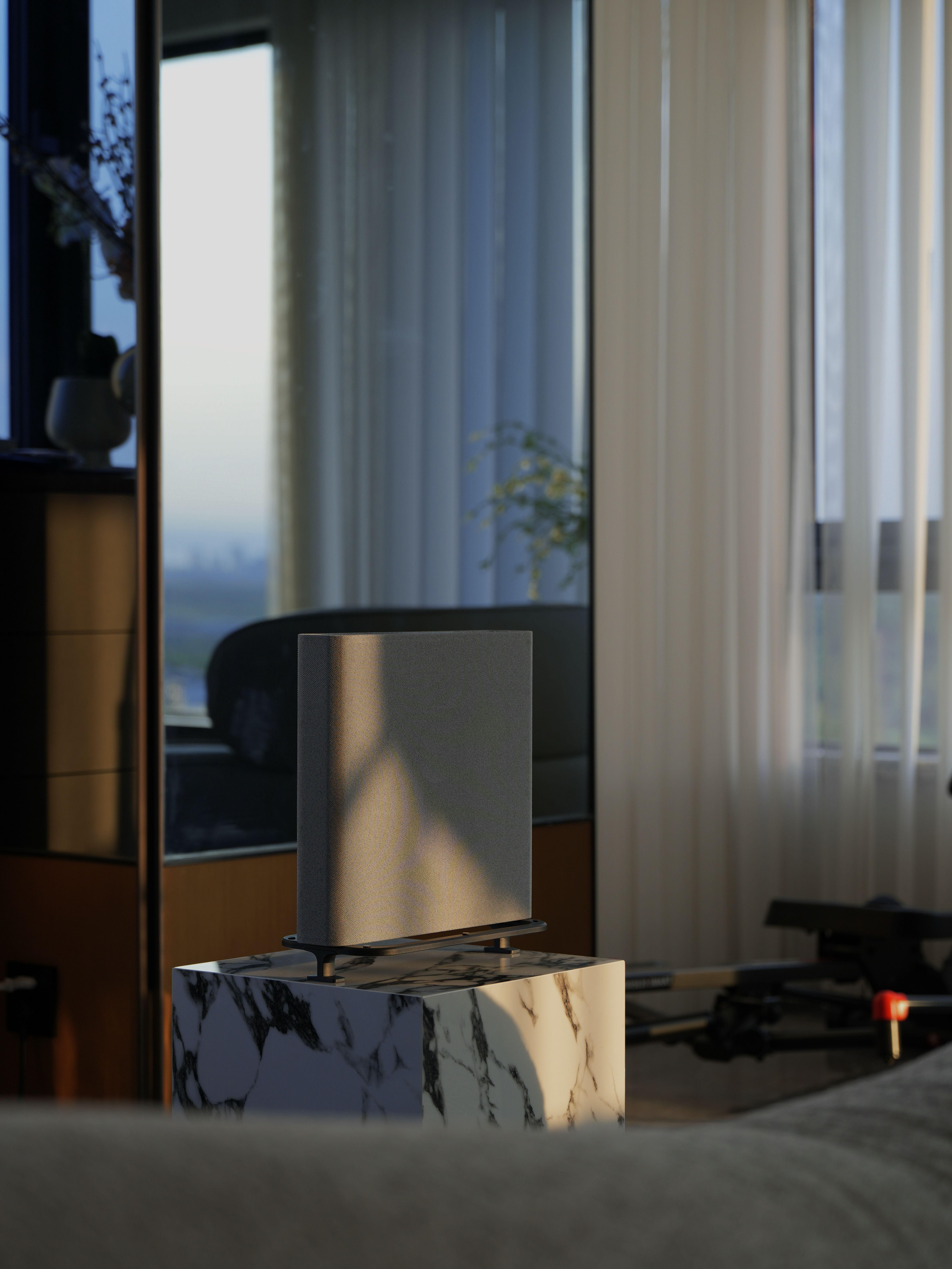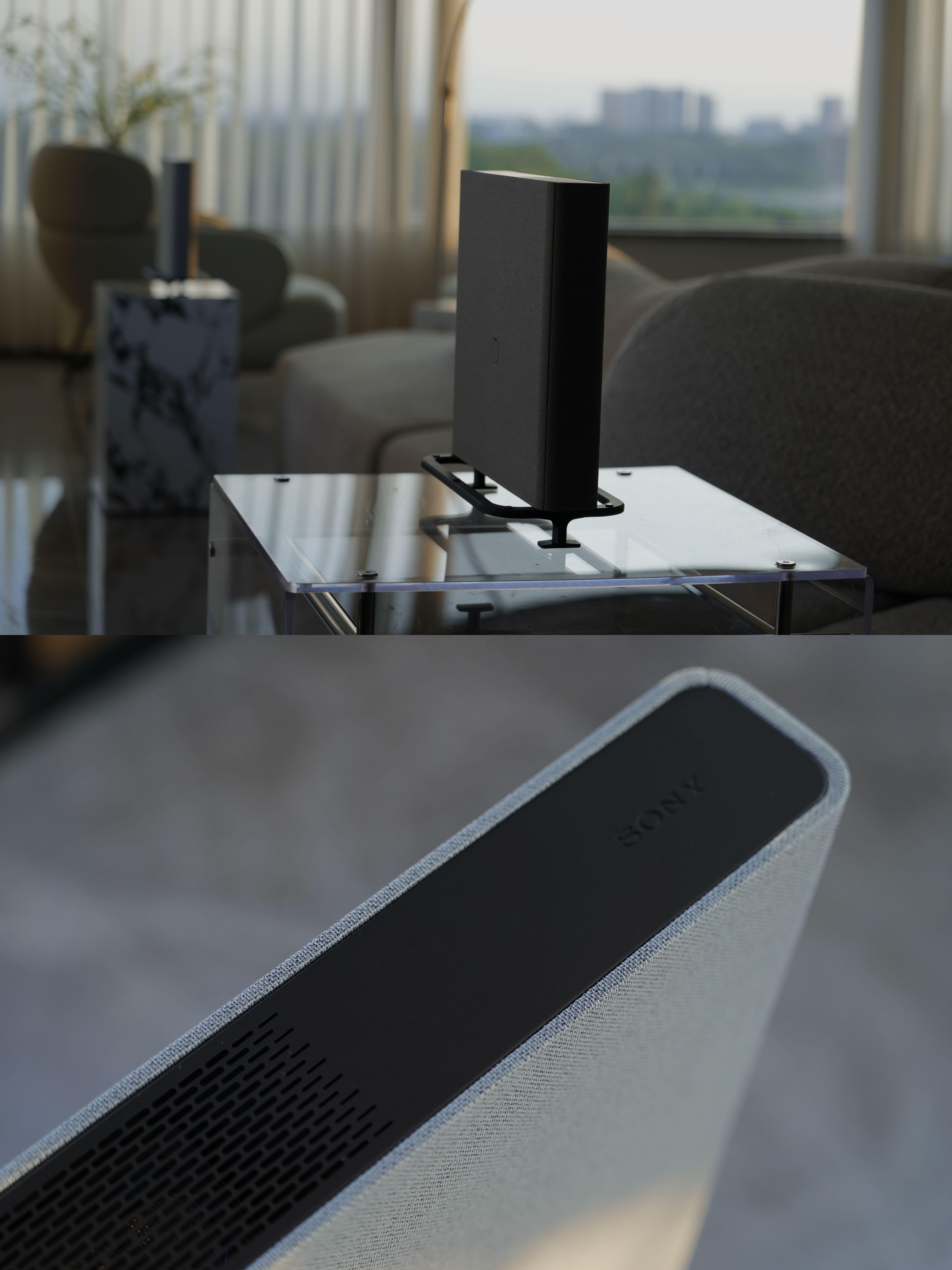 其二,创新分体式无线设计,更好匹配大尺寸电视,兼顾便捷性与家居美学。HT-A9M2采用分体式无线扬声器设计,仅需四台无线扬声器即可构建完整环绕声系统,无线信号输出功率较上一代提升约2.5倍,连接更稳定,有效摆脱线缆困扰,适配各类户型。产品采用灰色织物外观,纤薄机身搭配双用途支架,可桌面摆放或壁挂安装,简约设计能较好融入各类家居风格,打破传统家庭影院设备笨重、难以融入家居风格的局限。