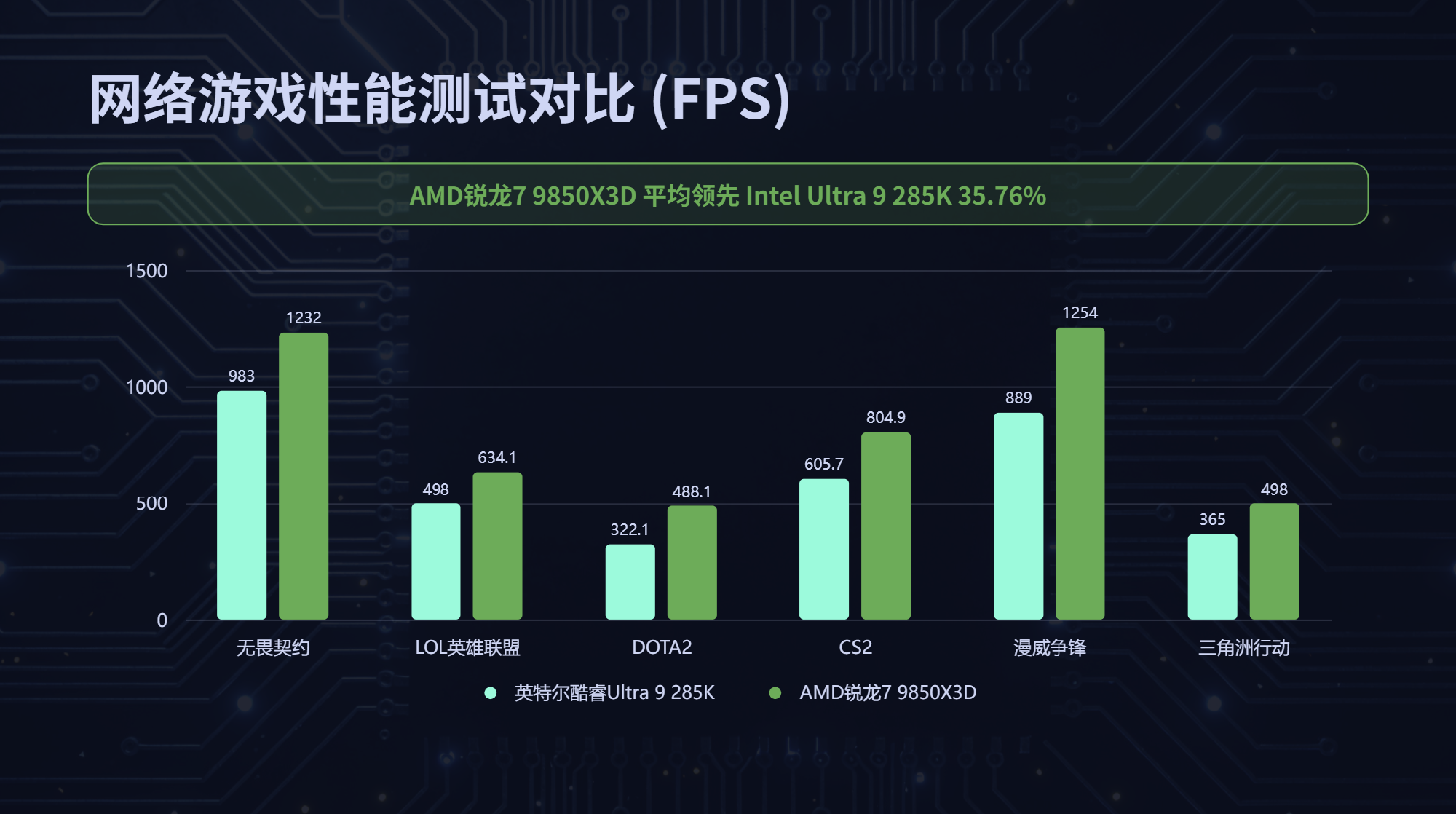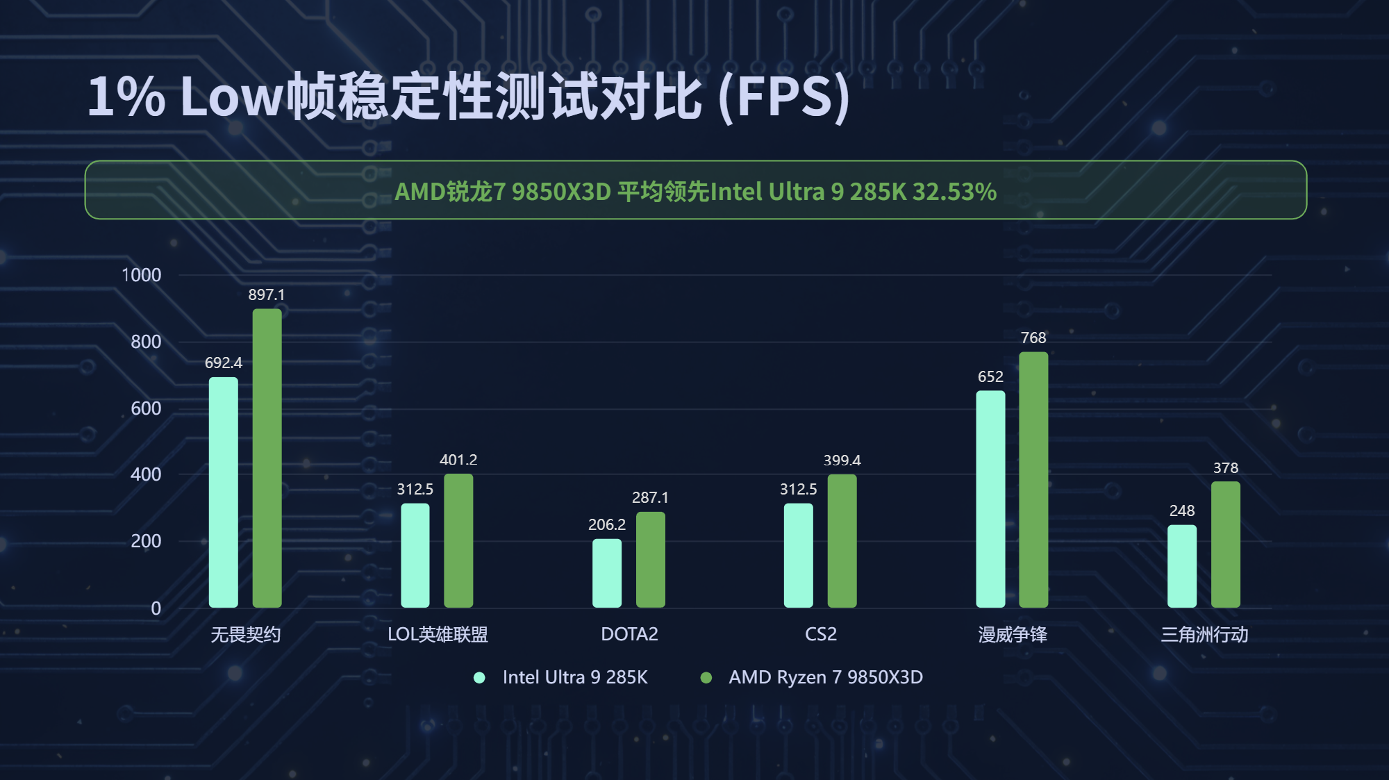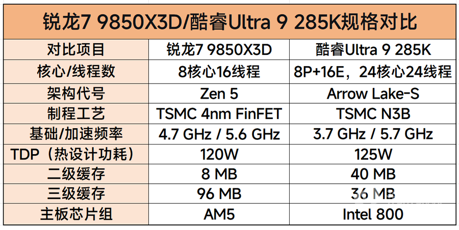 那么对于游戏玩家来说究竟值不值得升级,我们这次就通过对比给出答案。本次我们将通过实测,横向对比英特尔当前桌面级消费市场的旗舰产品酷睿Ultra 9 285K,看AMD能否继续守住游戏处理器赛道上的领先优势。测试将覆盖绝大多数玩家日常游玩的全品类游戏场景,从对处理器单核性能、缓存响应速度极度敏感的电竞网游,到对多核调度、持续性能释放要求严苛的3A单机大作;既会重点对比决定游戏性能上限的平均帧率,更会深度考量关乎实际游玩流畅度下限、直接影响操作跟手度的 1% Low 帧表现。我们一起来看看,锐龙7 9850X3D究竟能否续写X3D系列“游戏之王”的传奇。