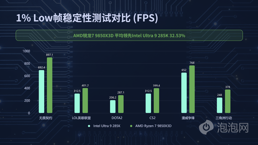 而作为衡量游戏是否流畅的1% Low帧对比当中,AMD锐龙7 9850X3D的1% Low对比英特尔Ultra 9 285K则领先超过35.76%,游戏体验更加丝滑,毫无疑问是当下最流畅的游戏体验。