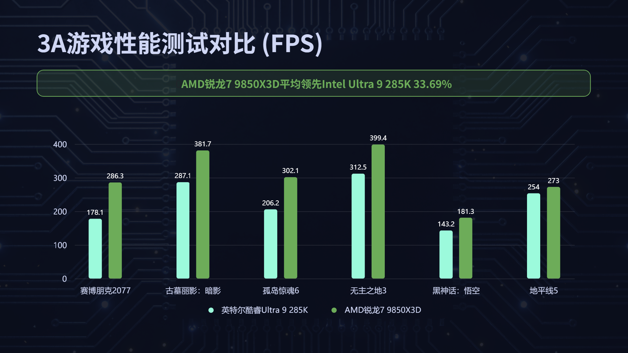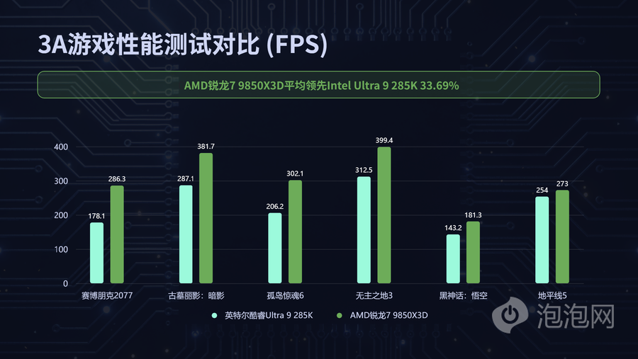 而在3A游戏性能表现上,在我们测试的6款主流的游戏当中,AMD锐龙7 9850X3D对比英特尔当家旗舰酷睿Ultra 9 285K平均领先幅度则是超过32.5%,在大作上的表现依旧是碾压级的,旗舰游戏性能无需多言。