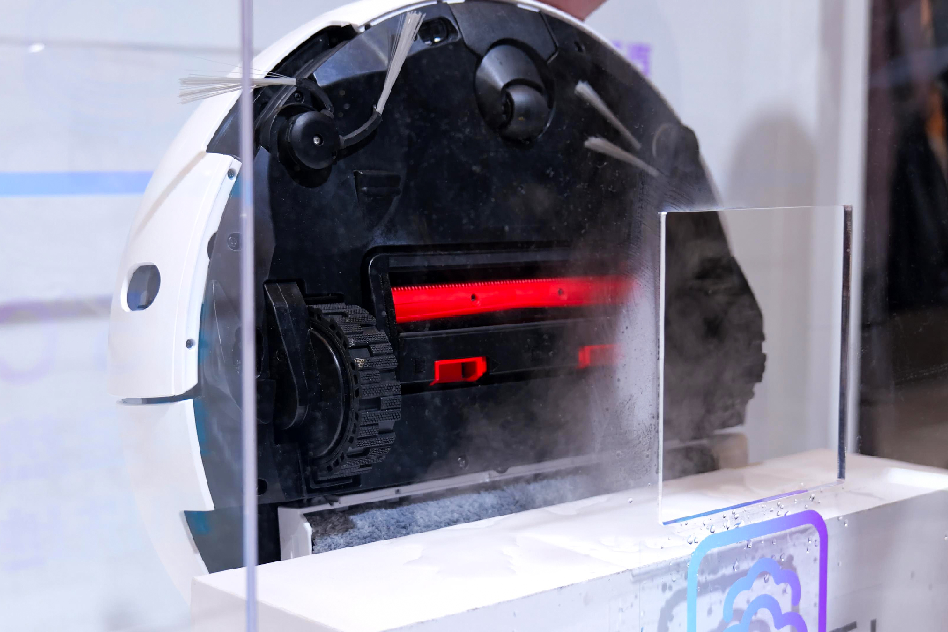 与此同时,HotSteam Wash澎湃蒸洗双热系统则为清洁加入了“蒸汽+热水”的组合拳。105℃双泵增压蒸汽先行软化顽固污渍并杀菌,85℃黄金热活水实时冲洗履带与滚刷,保证拖布干净、避免异味产生。双重热力协同,使清洁与杀菌同时升级,实现地面即洗即干、除菌率高达99.9%的效果。厨房重油、凝固酱汁、宠物呕吐物等过去需“人工救场”的极限场景,Stella都能轻松搞定。