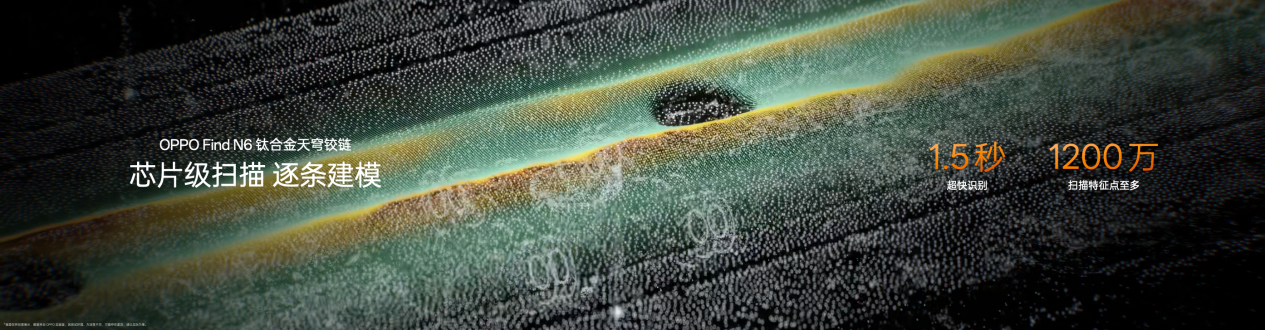 「新一代钛合金天穹铰链」,率先打破传统精密加工的极限。铰链采用行业首个仿生对称四轴结构,相较传统三轴铰链,扭力提升 20% 的同时,让铰链表面起伏从 0.18 mm 降至 0.1 mm,支撑面更广、受力更均匀,开合手感丝滑如一。但 0.1 mm 的起伏依然不够,OPPO 追求的是极致的平整。为此,OPPO 开创性地将芯片领域的精密加工技术应用于铰链制造,带来行业首创「芯片级高分子 3D 打印技术」,让铰链中板平整度至高提升 75% ,将微观天堑化为坦途。OPPO 更打造了行业首个专为平整而生的产线,让每一台 Find N6 的铰链都拥有极致统一的平整表现。