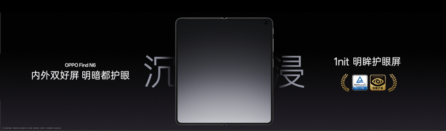 屏幕素质方面,OPPO Find N6 延续 OPPO 在显示领域的领先优势,内外双屏均搭载 1nit 明眸护眼屏,暗光下显示均匀清晰,告别抹布屏困扰;内外屏全局峰值亮度提升至 1800nits,烈日强光下依然清晰可见。同时,这块屏幕更通过了德国莱茵 TÜV「金标」护眼认证,提供「亮光看得清,暗光更护眼」的全场景舒适体验。