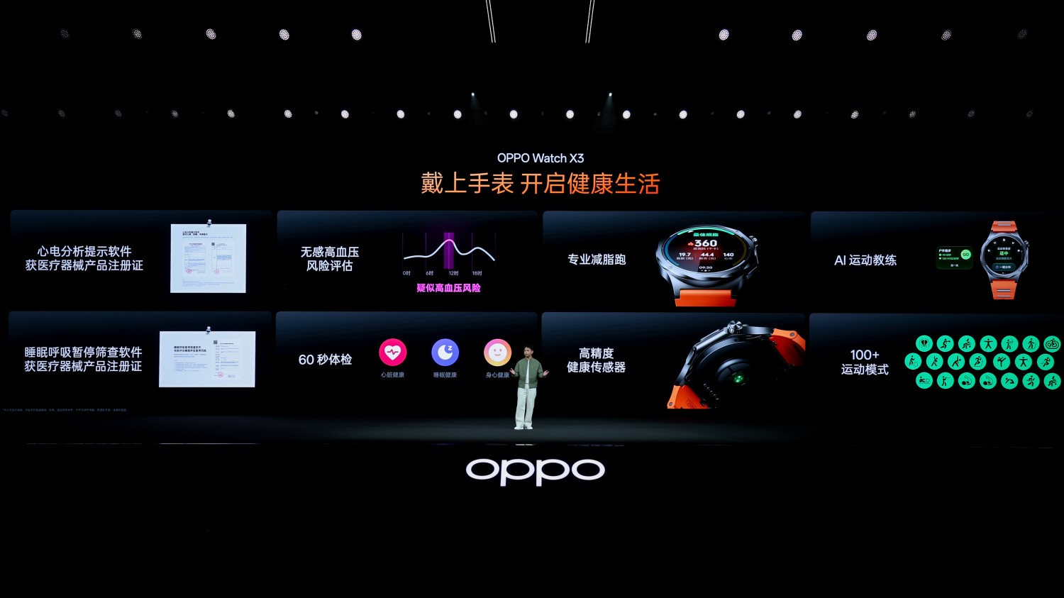 在 OPPO 运动健康成立五周年之际,OPPO 正式发布全新智能手表 OPPO Watch X3。作为新一代安卓表皇,OPPO Watch X3“无感高血压风险评估”全新升级,从风险预警到主动干预,构建起完整的血压健康管理闭环。同时,OPPO Watch X3 采用全钛先锋设计,并同步升级专业运动与全智能互联能力,为用户带来更轻薄、更专业、更贴心的腕上健康与智能体验。