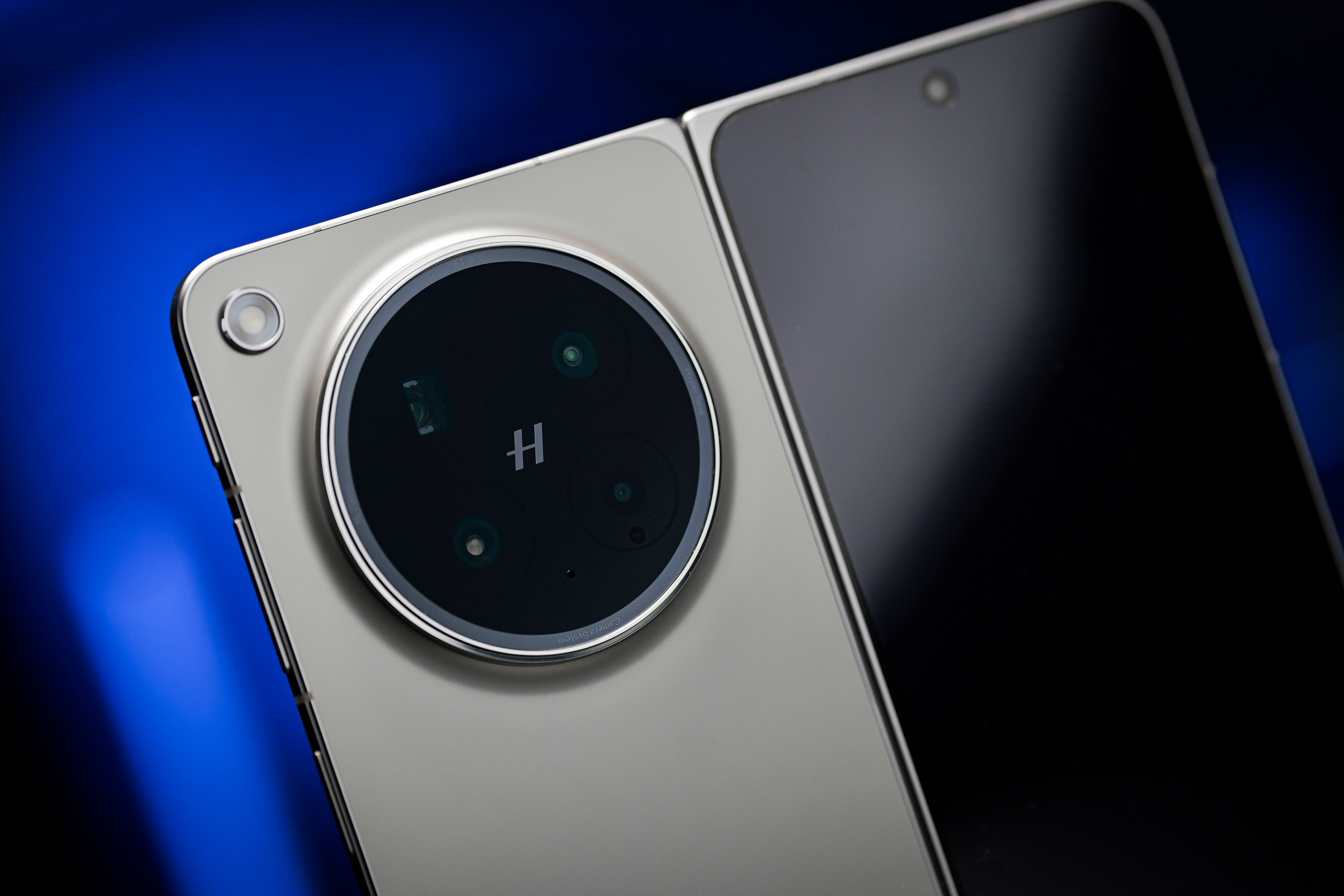 镜头部分采用双环同心流光DECO设计,外环高亮、内环哑光,四枚镜头以哈苏“H”标识为中心对称排布,转动机身时光影流转,颜值拉满。