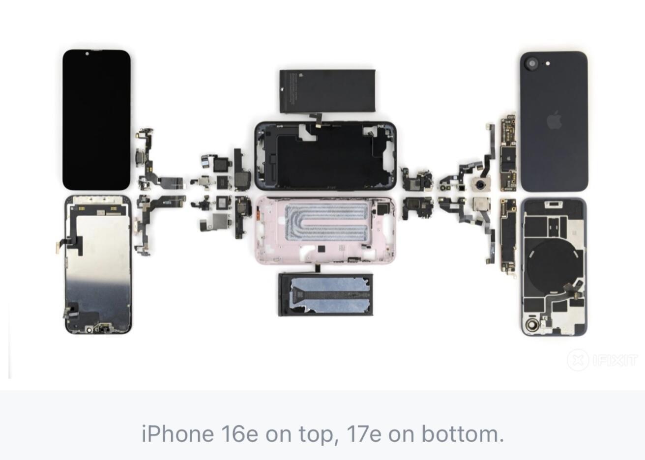 直到昨天国外知名拆解网站iFixit的拆解报告出炉后,真相彻底藏不住了:除了A19芯片、MagSafe线圈,机身、电池、摄像头几乎全照搬16e,老壳子、老电池、老模具,连保护壳都能通用。