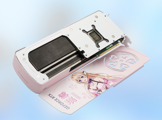 外观与氛围感设计上,整卡以温柔治愈的淡粉色为主调,将樱花元素贯穿全卡细节。其采用对称式柔和造型,正面实现樱粉色从右到左的自然渐变,三枚散热风扇中,除中间带有AX品牌标识外,左右两把扇心均印有专属樱花纹样;背面同色系渐变金属背板印有「雪璃」专属立绘,搭配与角色配饰呼应的爱心散热圈,氛围感拉满。本次同步亮相的「雪璃」IP,采用金发紫眸灵动造型,融合樱花元素与机能风设计,为显卡赋予了专属辨识度。显卡侧面GEFORCE RTX标识采用镂空设计,内置樱花主题ARGB灯效,支持自定义调节与整机灯效联动,开机即可绽放灵动柔和的樱花光影。
