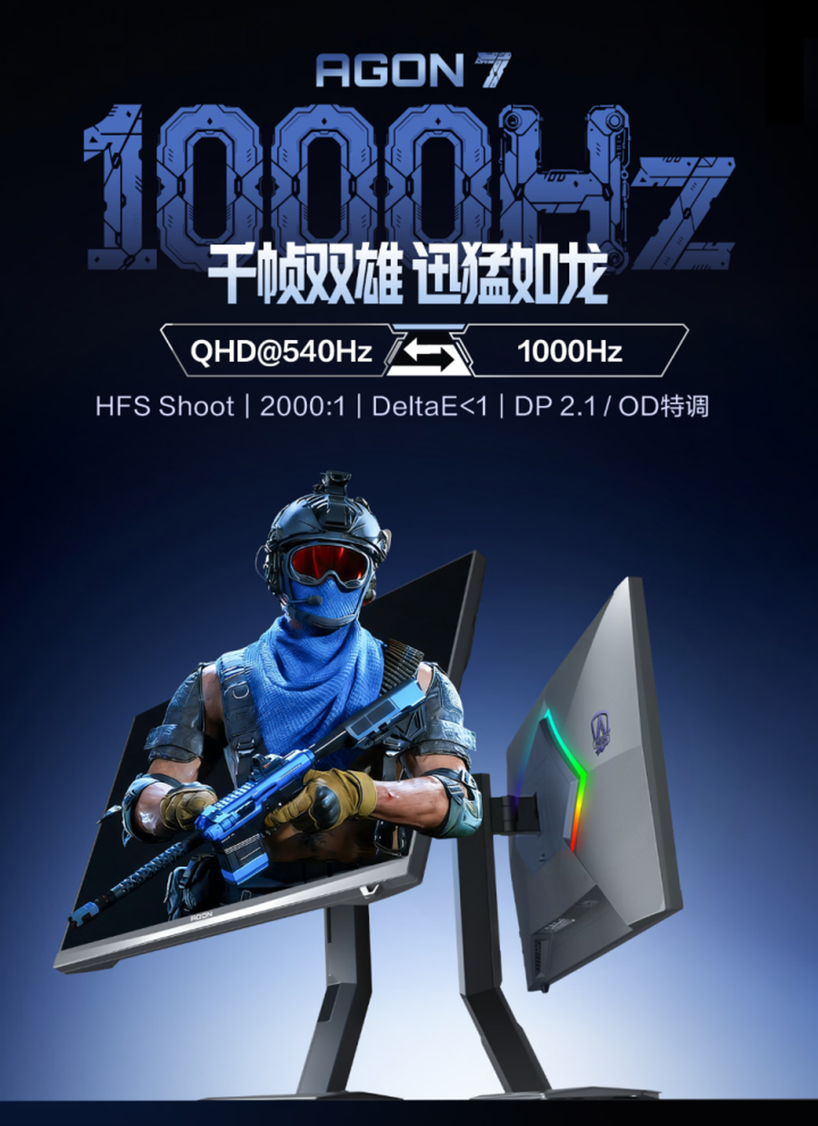 硬核性能是AGON爱攻双模千帧电竞显示器AGP277QK的核心竞争力,而“原生千帧+双模适配”的双突破设计,更是其颠覆行业的关键所在。AGP277QK搭载TCL华星专为电竞场景研发的HFS Shoot面板技术,可实现QHD@540Hz与HD@1000Hz双模一键切换,成为目前最适配全类目FPS竞技的地表最强“竞技外挂”。