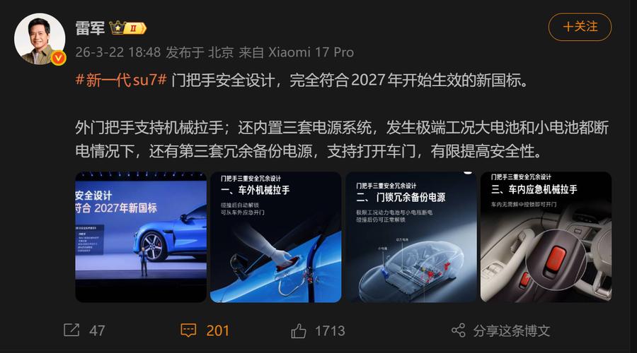 新一代SU7在外观上并没有太大变化,但内部的升级却有着不小变化,其中,备受网友关注的门把手就是重点升级项目之一。雷军在微博上发文表示,新一代SU7的门把手安全设计完全符合2027年开始生效的新国标。