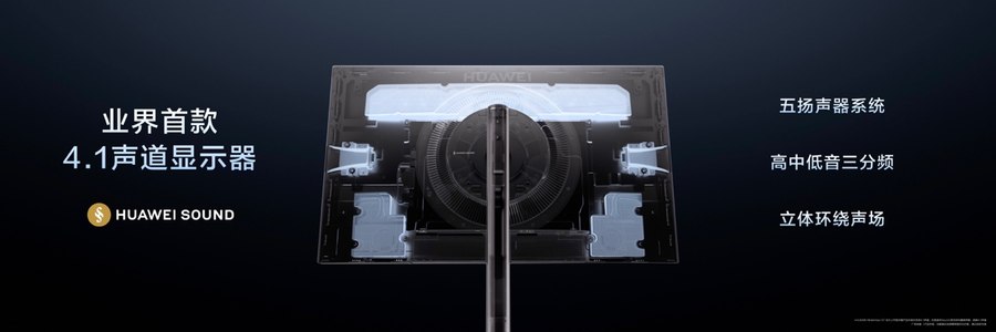 比起一般的显示器,华为MateView GT在音频体验上带来了显著突破,支持华为悦彰(HUAWEI SOUND)音效,更是首款搭载4.1声道三分频系统的显示器,内置五个扬声器,彻底告别了传统显示器单薄的双声道音效,无需额外搭配桌面音箱,就能打造出极具包围感的环绕声场。三分频架构让声音表现实现了全频段的优质输出:低音强劲澎湃,中音澄澈饱满,高音透亮细腻,人声对白清晰自然,无论是观影时的沉浸式音效,还是游戏里的听声辨位,都能带来身临其境的极致视听盛宴,同时也让桌面告别了繁杂的音箱线材,保持整洁美观。