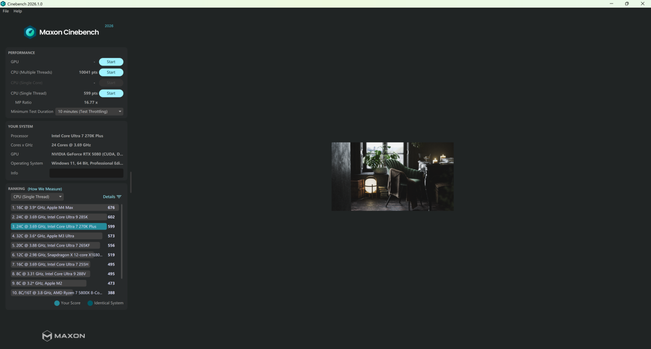 CineBench是业界通用的处理器基准测试软件,我们也使用了不同的版本进行了测试。在最新版本的Cinebench 2026当中,Ultra 7 270K Plus十分钟循环测试成绩为单核599pts,多核10041pts,多核成绩相比Ultra 7 265K提高了7.7%左右,单核成绩则是有着24%的提升。