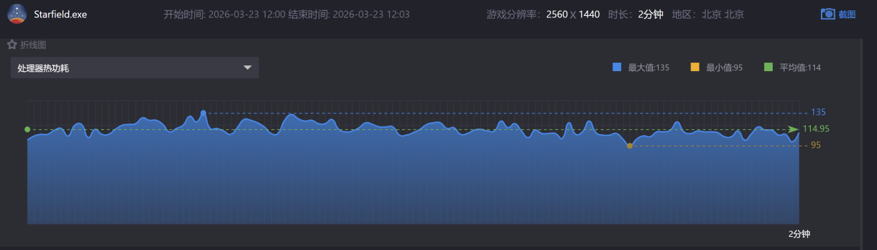而在功耗方面,我们也在实际运行性能要求不低的《星空》时进行了记录,在记录的时间段当中平均功耗为115W,整体还是比较节能的,长时间游戏也不会出现过热降频的情况。