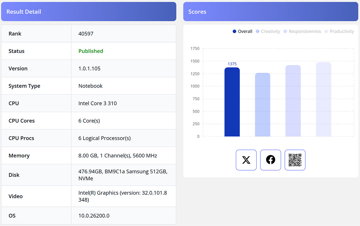 另一款定位更低的酷睿3 310处理器,则出现在CrossMark测试数据库中。测试信息显示,该处理器为6核6线程规格,测试平台为戴尔的测试笔记本,搭载单通道8GB 5600MHz内存、512GB三星NVMe固态硬盘,最终整体得分为1375分。受限于单通道内存的测试环境,该成绩的参考性存在一定局限,其完整平台下的性能表现仍有待后续进一步验证。