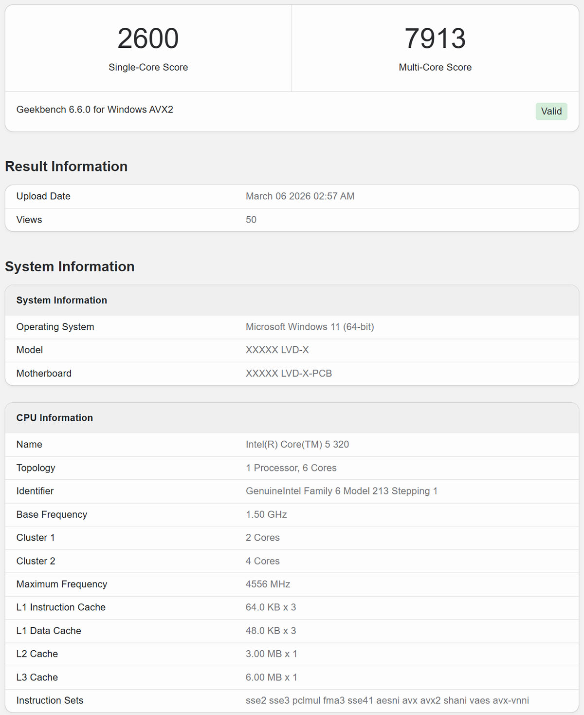 目前,已有两款Wildcat Lake系列处理器现身基准测试数据库,其实际性能表现也随之曝光。其中,酷睿5 320处理器登陆Geekbench 6.6.0 for Windows测试平台,数据显示,该处理器基础频率1.50GHz,最高睿频可达4.556GHz(约4.6GHz),配备6MB L3缓存,延续了2P+4E的6核规格。跑分成绩上,其单线程得分达到2600分,这一表现与酷睿i5-14600、酷睿Ultra 9 285H以及锐龙AI 9 HX 375等处理器处于相近水平;多线程得分7913分,基本与锐龙5 8640U、锐龙5 7540U处于同一梯队。