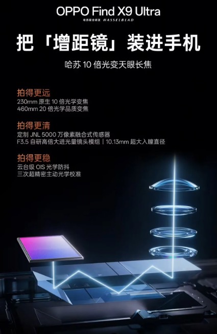 而这款新机的长焦核心配置,此前便已有官方信息披露,OPPO Find 系列产品负责人卓世杰早前曾透露,Find X9 Ultra 搭载了全新的哈苏 10倍光变天眼长焦,为了实现极致的长焦拍摄效果,该机更是首创5反射棱镜设计,让镜头的等效焦距达到460mm,带来了远超行业同档位产品的长焦硬件基础。
