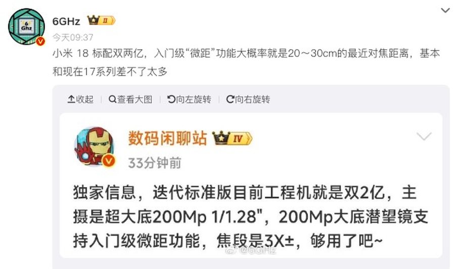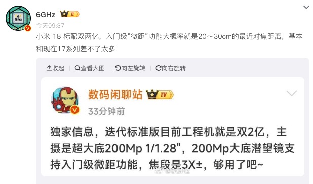 据悉,小米 18 标准版的双 2 亿像素影像组合配置拉满,不仅配备一颗 2 亿像素、1/1.28 英寸的超大底主摄,还搭载了一颗同规格的 2 亿像素潜望式长焦镜头。这颗潜望式长焦镜头并非基础款配置,还支持长焦微距功能,同时具备 3 倍光学变焦能力,一颗镜头兼顾多场景拍摄需求,让小米 18 标准版的影像覆盖能力大幅增强。