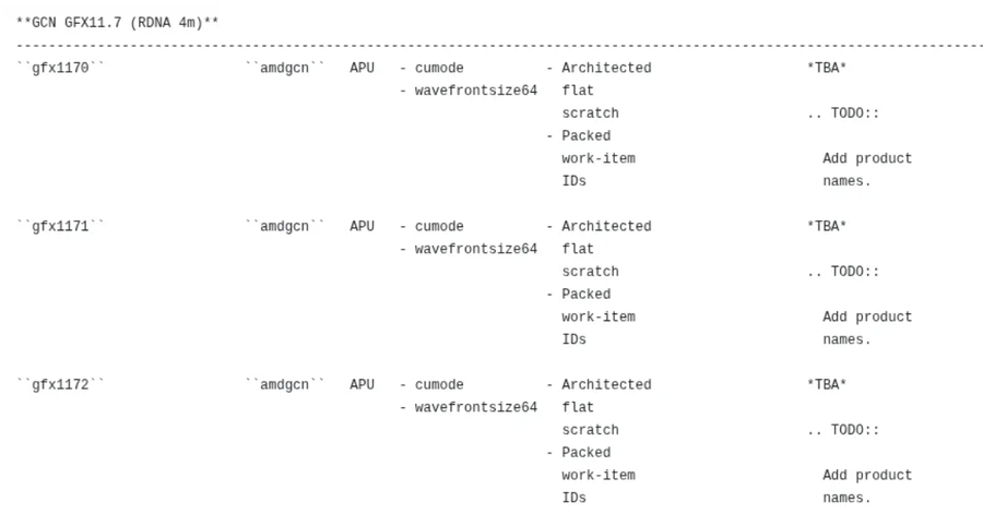近日,AMD在开源LLVM编译器的待合并请求中,新增了GFX1171、GFX1172两款图形核心ID,二者与今年2月首次曝光的GFX1170一同被归入全新的RDNA 4m图形架构分支,标志着AMD正在快速扩充这一定位APU核显的新架构产品矩阵,为下一代Zen6移动平台铺路。从架构定位来看,RDNA 4m并非AMD正统的下一代独显架构。AMD全新RDNA 4独立显卡采用GFX12家族核心,而RDNA 4m隶属于GFX11家族,是基于原有RDNA3/RDNA3.5架构的定制化迭代产物。该架构最初以RDNA3.5的代号现身,随着编译器补丁的持续更新,正式完成了向RDNA3.5+、最终定名RDNA 4m的演进,成为AMD面向集成显卡市场的专属架构分支。