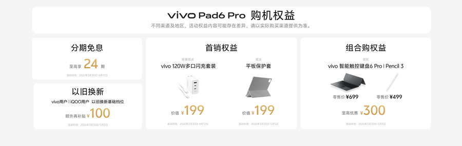 目前,vivo Pad6 Pro已在vivo官网及各大电商平台开启预售,并于4月3日正式开售。上市价格4499元起,首销期间可享多重优惠。
