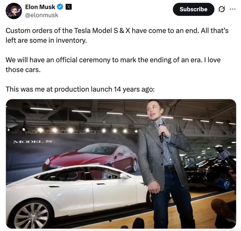 马斯克于 X 平台正式宣布,特斯拉 Model S、Model X 两款旗舰车型全面停产、停止新车定制订单,全球消费者仅可选购现有库存现车;特斯拉美国、中国官网已同步调整,车型入口跳转至库存选购页面。
