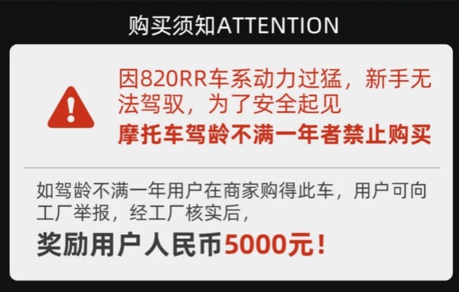 事件的缘起,离不开张雪机车近期的高光时刻。3月29日,在世界超级摩托车锦标赛(WSBK)葡萄牙站WorldSSP组别比赛中,张雪机车一战成名,成功斩获冠军,打破了欧美日品牌在该赛事中的长期垄断,也让品牌全网热度飙升,旗下车型备受关注。而早在3月21日,张雪机车夺冠同款仿赛车型820RR开启预定之际,便立下了一条出圈“铁规”:因该车型动力过猛(最大马力135匹,零百加速2.81秒),新手难以驾驭,为保障骑行安全,明确禁止摩托车驾龄不满一年者购买该车。