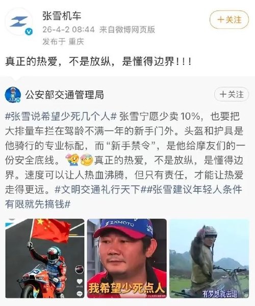 今日上午,张雪机车官方账号转发公安部交通管理局相关微博,并发布回应:“真正的热爱,不是放纵,是懂得边界!!!”,以强烈的态度呼应官方认可,进一步传递品牌坚守安全底线的理念。