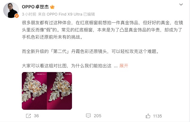 为直观展现第二代丹霞色彩还原镜头的实力,卓世杰同步晒出实测对比图。在常见的红底黄金展示橱窗场景中,友商机型拍摄的照片色彩已完全脱离实际,出现明显失真;而搭载第二代丹霞色彩还原镜头的Find X9s Pro,能够完美还原黄金本身纯正、高级的色泽,色彩还原精度优势凸显。