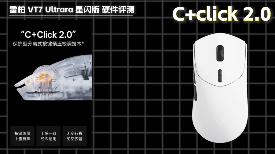 硬件细节用料扎实,耐用性直接拉满。鼠标搭载C+click 2.0保护型按键预压技术,新增防掰限位结构与抗摔扭簧保护,日常高强度点击、激烈操作,也能长久稳住按键手感,长期使用不会出现松动、手感跑偏的问题。同时配备分离式微动PCB,左右按键可独立调校,从根源保障每一次点击的触发一致性。核心配件全部选用旗舰规格:1亿次使用寿命的欧姆龙机械微动,按压清脆利落、反馈灵敏;200万次耐用度的凯华定制编码器,滚轮刻度清晰、阻尼适中;底部配备99.95%高纯度铁氟龙大脚贴,滑动阻力极低,桌面移动丝滑顺畅,FPS游戏急停跟枪精准度大幅提升。