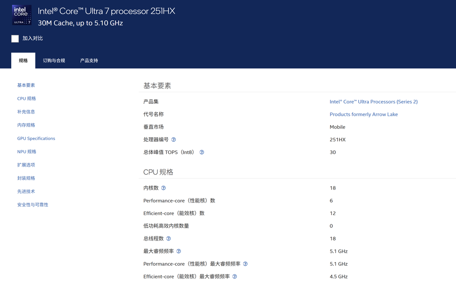 英特尔近日在官网悄然上线了此前多次被PC厂商配置泄露的酷睿Ultra 7 251HX处理器。这款产品并未伴随任何官方发布公告,仅通过规格页面确认了其存在并公布了完整参数,精准填补了酷睿Ultra 5 245HX与Ultra 7 255HX之间的市场空白,将成为2026年中端游戏本的核心处理器选择。酷睿Ultra 7 251HX并未采用最新的Arrow Lake Refresh架构,而是沿用了初代Arrow Lake-HX设计,采用台积电N3B工艺制造。其核心规格为6个性能核(P-Core)+12个能效核(E-Core),总计18核18线程,配备30MB英特尔智能缓存。与定位更高的Ultra 7 255HX相比,它减少了2个P-Core,但完整保留了相同数量的E-Core和三级缓存;而对比入门级的Ultra 5 245HX,则多出4个E-Core,三级缓存也提升了6MB,在多线程生产力和游戏多开场景下优势显著。