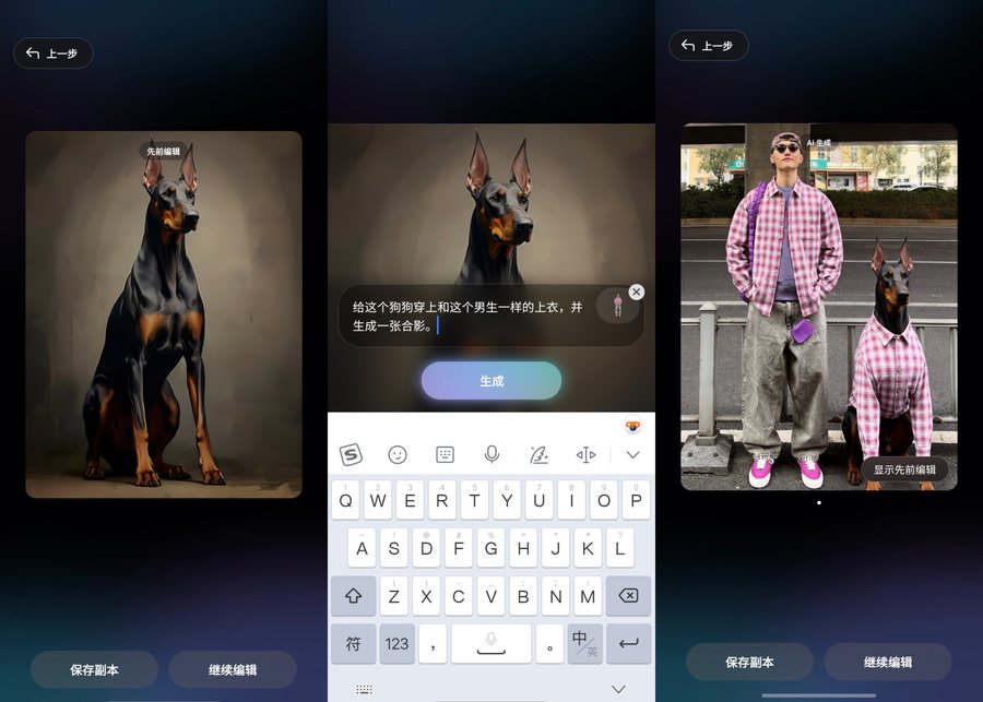 全新上线的创意工作室功能,让影像创作的门槛大幅降低。只需动动嘴,就可以利用AI生成图片,比如给狗狗穿上和主人一样的衣服,还能将二者放在一起成为合影,普通用户也能轻松打造个性化创意画面。