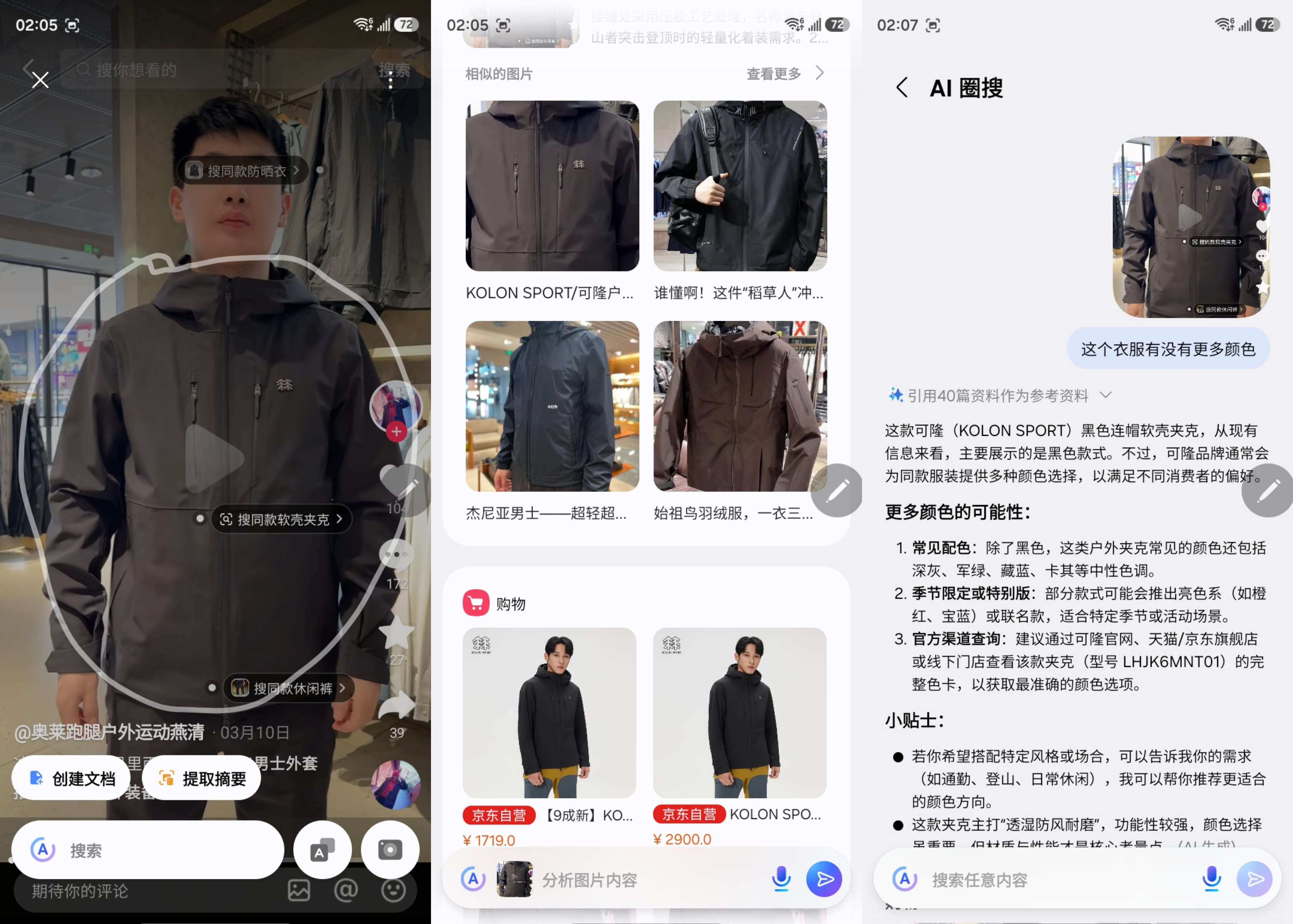 即圈即搜功能在本次升级中实现了体验上的跨越式提升,不仅强化了多目标识别能力,更新增了智能服务推荐机制。刷短视频时,圈出画面中的衣服、背包等物品,系统不会再推送杂乱无章的链接,而是精准聚合产品详情、品牌信息、比价渠道及直接购买入口,更支持针对圈选内容进行多轮追问,比如“这个背包有没有其他颜色”,AI会即时给出精准回复。