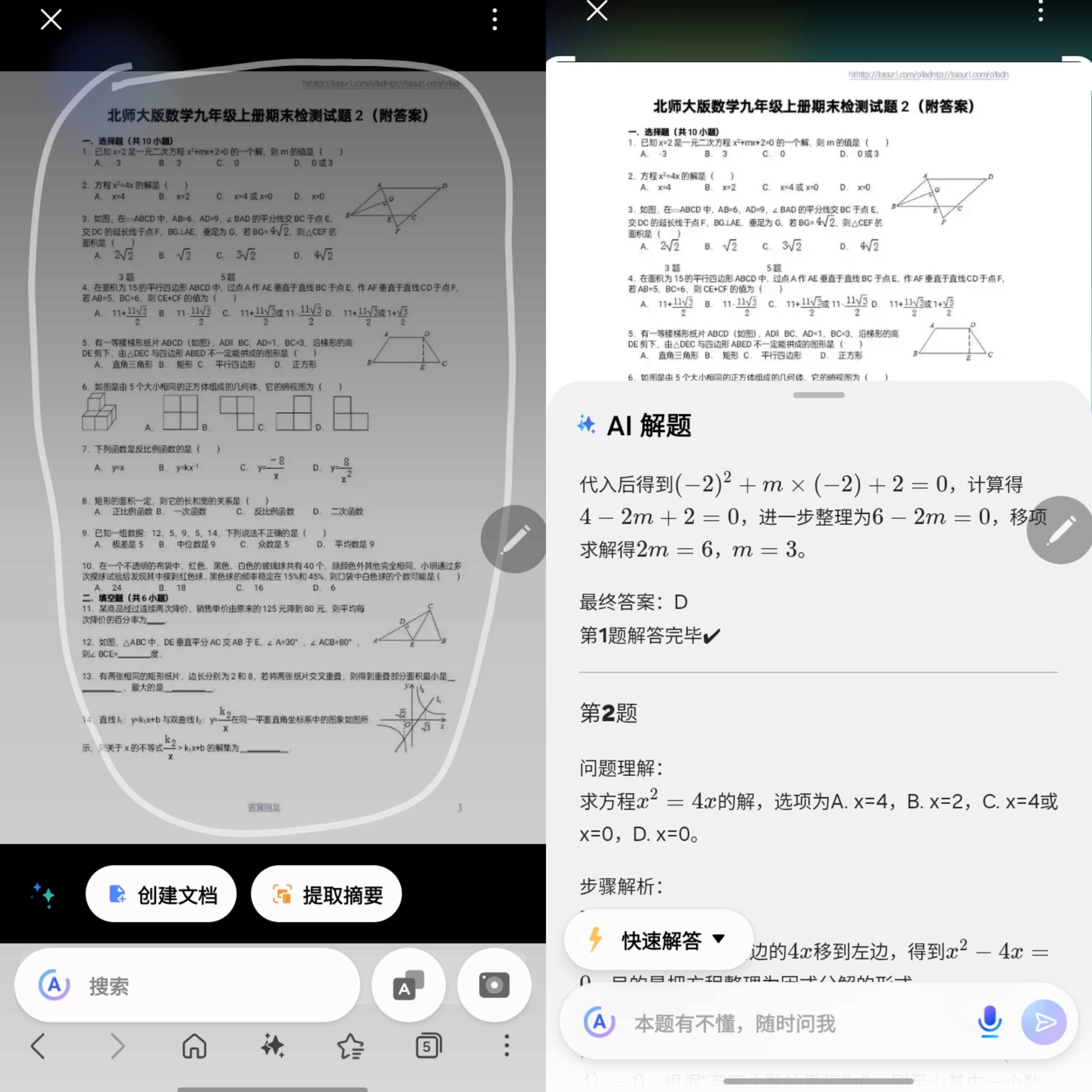 即圈即搜还能用来给学生解题,直接圈选整张试卷的题目,AI就可以将所有题目逐一解答,效率和准确度都非常高。