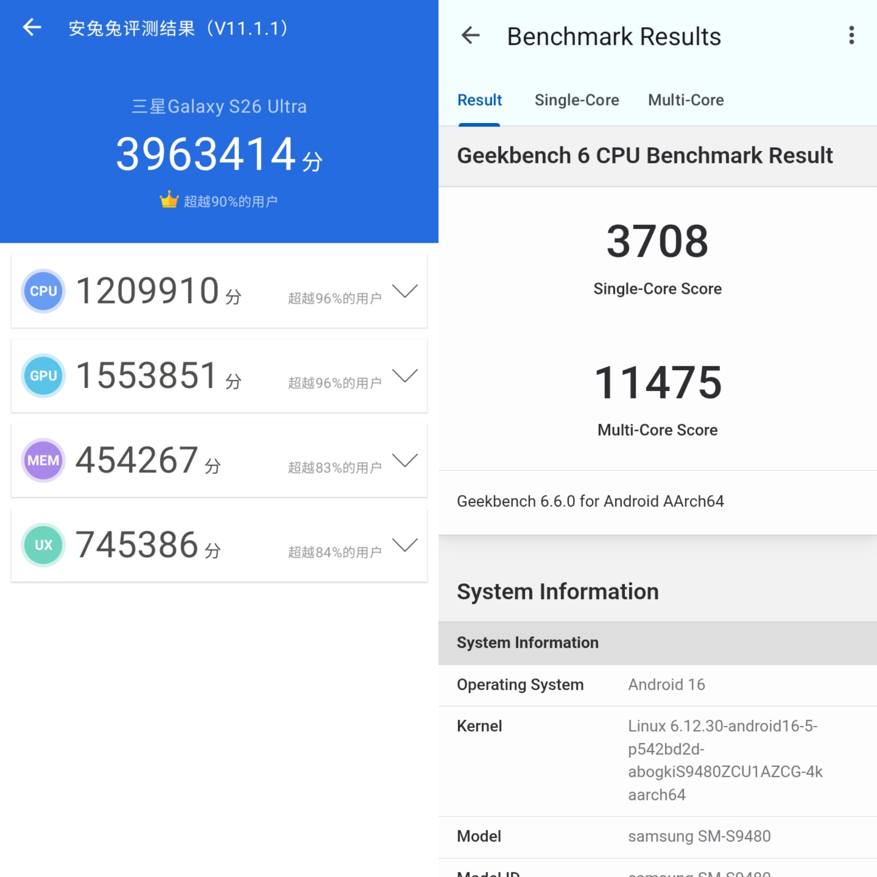 在性能实测中,我们这台三星Galaxy S26 Ultra的安兔兔成绩轻松突破396万,位列当下安卓旗舰的第 一梯队。GeekBench6单核3708,多核11475,同样实力不俗。在日常使用中,无论是多任务切换、大型应用启动,还是浏览高清视频,都能保持极致流畅,没有任何卡顿感。